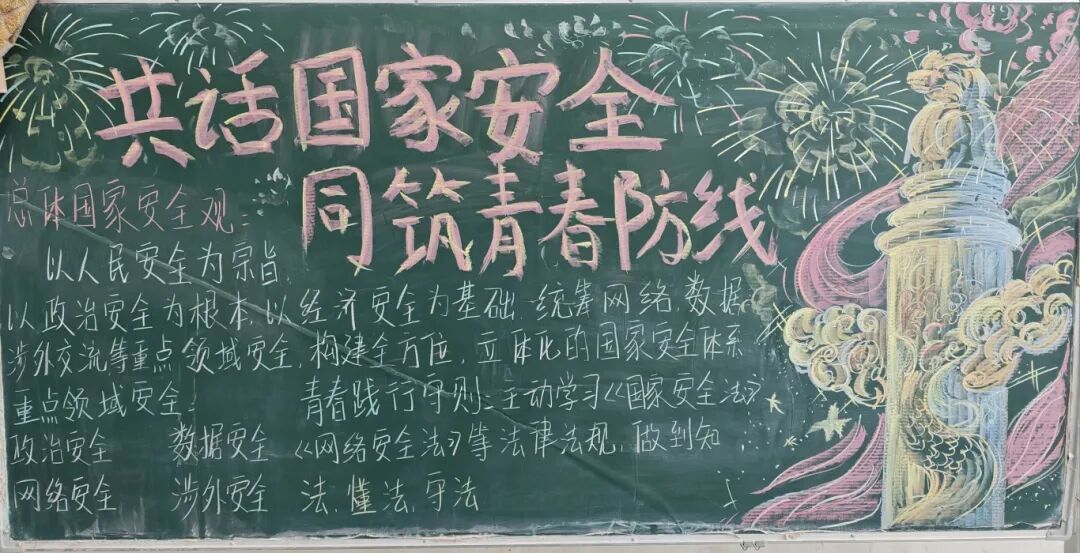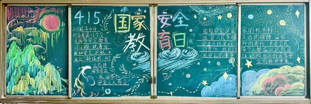 主题板报展风采,营造浓厚宣传氛围。为营造沉浸式安全教育氛围,各班级精心策划、用心创作,推出了一批主题鲜明、设计精美的国家安全主题黑板报。 同学们以粉笔为笔、以黑板为纸,将“国家安全”的核心要义融入创意设计中:有的以山河、五星、华表为元素,彰显家国情怀;有的以星空、海浪为背景,传递守护理念;有的详细标注总体国家安全观内涵,科普安全知识。 一幅幅图文并茂的黑板报,既展现了同学们的创意与才华,更让国家安全理念以生动鲜活的方式融入校园角落,让师生在潜移默化中接受安全教育,真正实现“抬头可见、驻足即学”,让安全意识入脑入心。